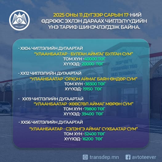 Энэ сарын 17-ноос эхлэн орон нутгийн дараах чиглэлүүдийн автобусны үйлчилгээний тариф шинэчлэгдэхийг