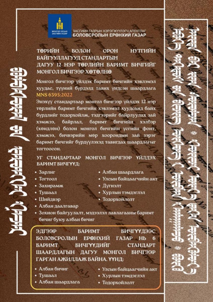 Төрийн болон орон нутгийн байгууллагууд стандартын дагуу 12 нэр төрлийн баримт бичгийг монгол бичгээ